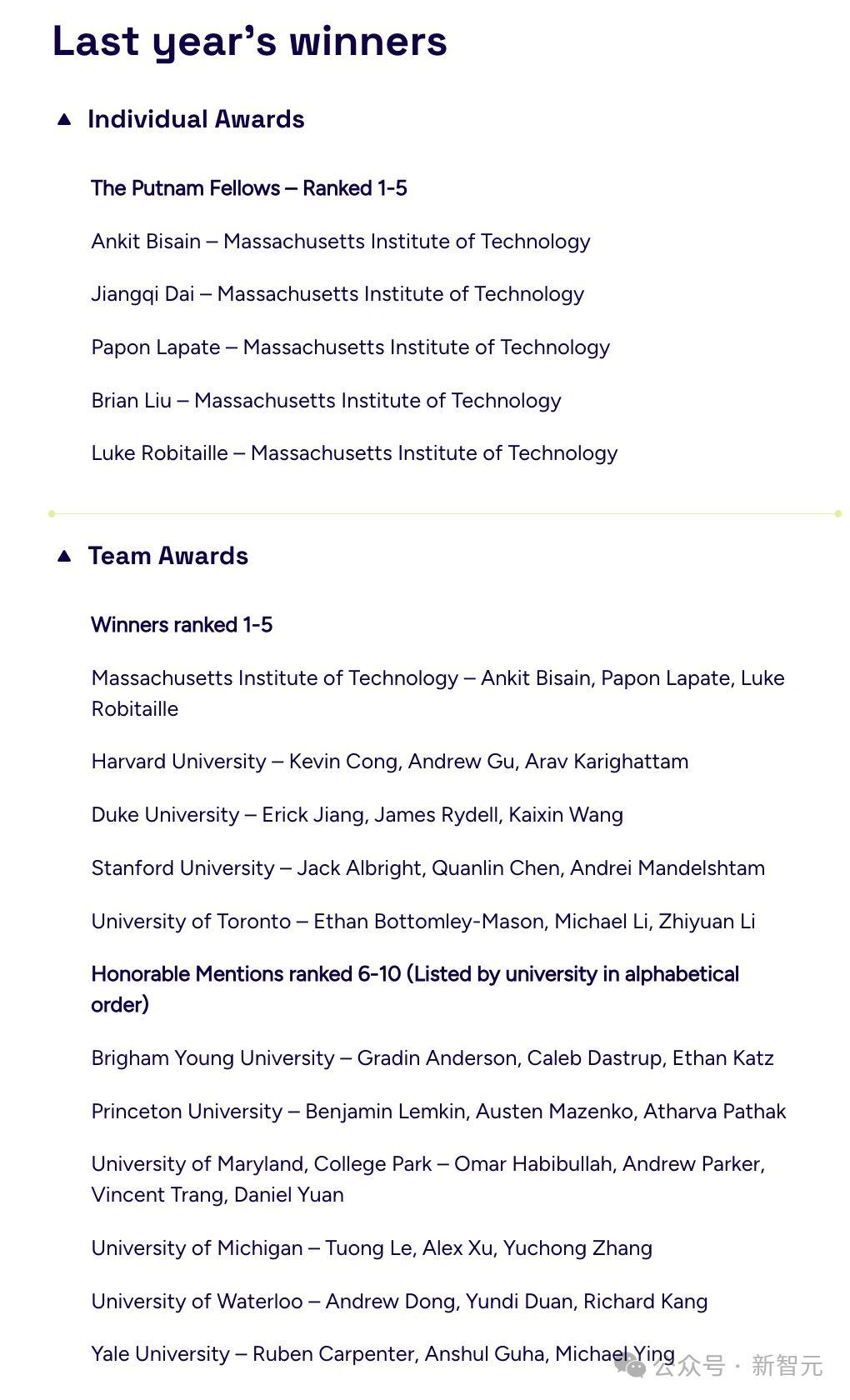 去年第84届比赛中,个体获奖者5名全部来自MIT,团体获奖者前五名也分别来自世界高校:MIT、哈佛、杜克、斯坦福、多伦多大学。
