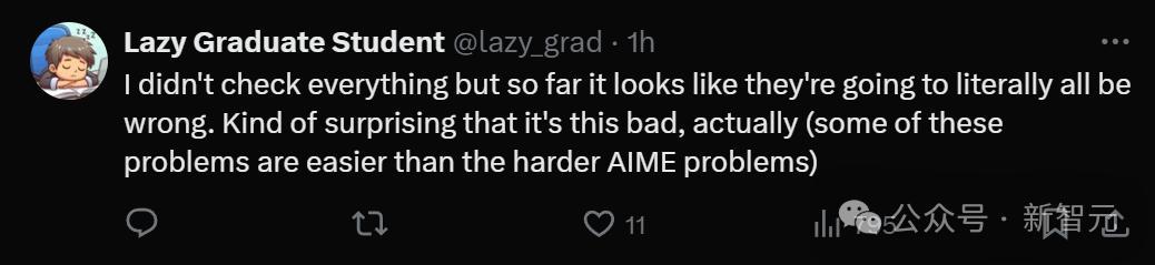 这个结果属实有点惊人,因为其中一些问题难度没有那么高,比一些AIME竞赛题容易。