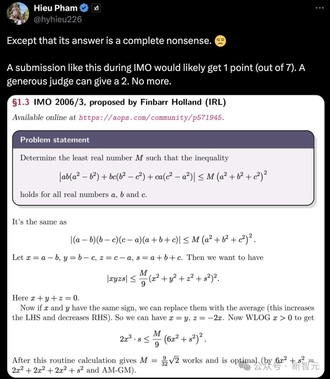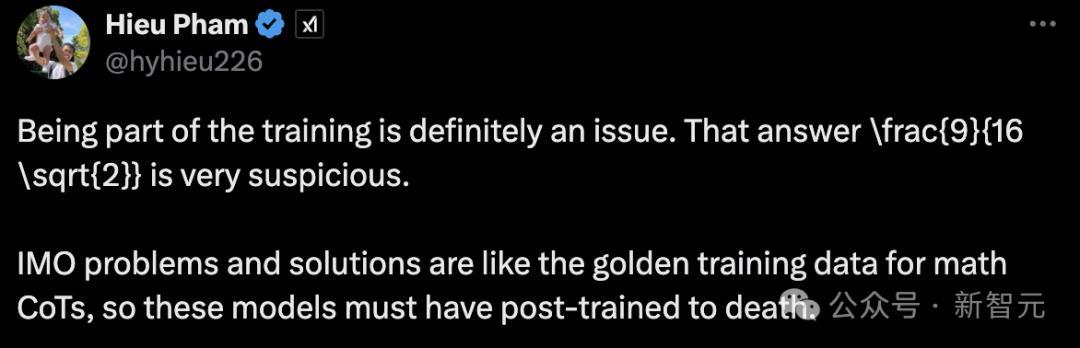 他接着称,训练数据问题是一部分,这个答案 rac{9}{16 \sqrt{2}}很可疑。IMO的题目和解答就像是数学CoT的黄金训练数据集,所以这些模型一会被反复训练无数遍。