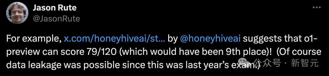 在这场比赛中,o1-preview拿下了79分(满分120)位列第9,o1-mini取得了73,排名第19。