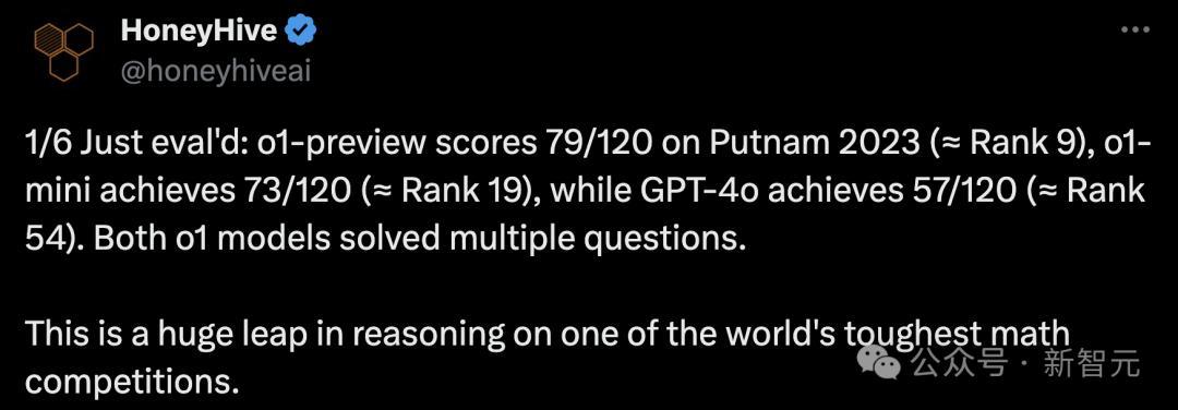 今年9月,o1发布不久后,AI评估平台HoneyHive曾让新模型去挑战了23年普特南数学竞赛的题目。