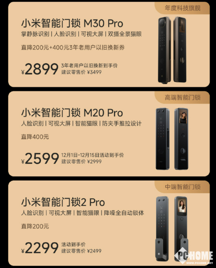 在小米门锁六周年之际,小米推出感恩回馈活动,热门门锁产品都有优惠,其中小米智能门锁M30 Pro到手价2899元,直降200元+3年老用户可以以旧换新。小米智能门锁M30 Pro支持掌静脉识别、人脸识别、搭载可视大屏、搭载双摄全景猫眼。