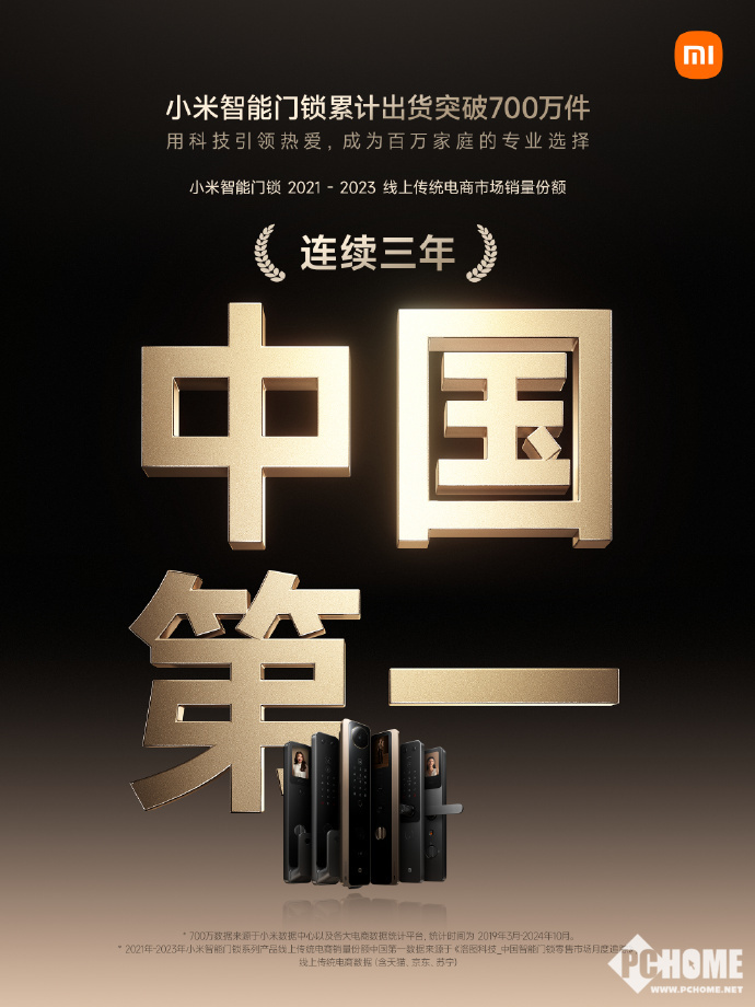 据了解,700万数据来源于小米数据中心以及各大电商数据统计平台,统计时间为2019年3月-2024年10月;2021年-2023年小米智能门锁系列产品线上传统电商销量份额中国第一数据来源于《洛图科技_中国智能门锁零售市场月度追踪》,线上传统电商数据(含天猫、京东、苏宁)。