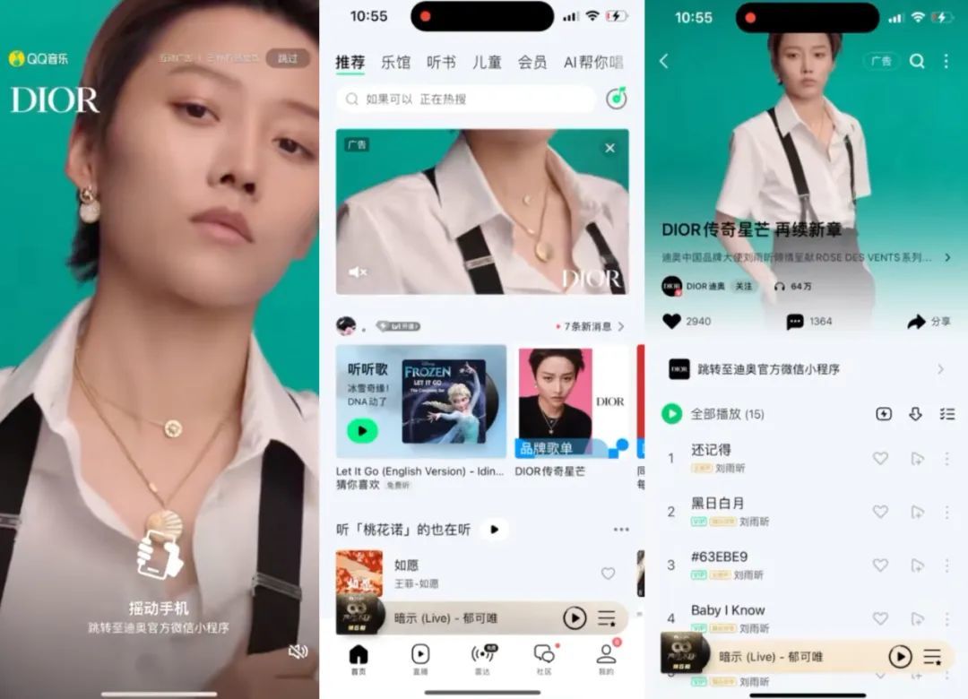 QQ音乐与Dior的合作是一个典型案例:站内以歌手刘雨欣出镜的“超级闪屏OneShot”广告样式,实现开屏和5秒焦点图视频的无缝联动;通过每日歌单的形式,向用户传递Dior的品牌信息;而平台还利用个性化推送功能,将其推送给了更多粉丝群体。这份歌单的播放量超过200万次,收藏量超过5万,评论数接近2000条,创下了QQ音乐歌单商业化合作历史上的单日最佳纪录。