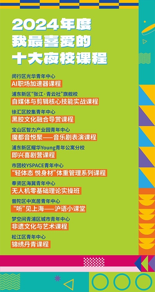 经全市各青年中心·青年夜校点位自主推荐,经专家学者、社会组织负责人、青年中心负责人代表集中评审,2024年度“我最喜爱的十大夜校课程”名单揭晓。