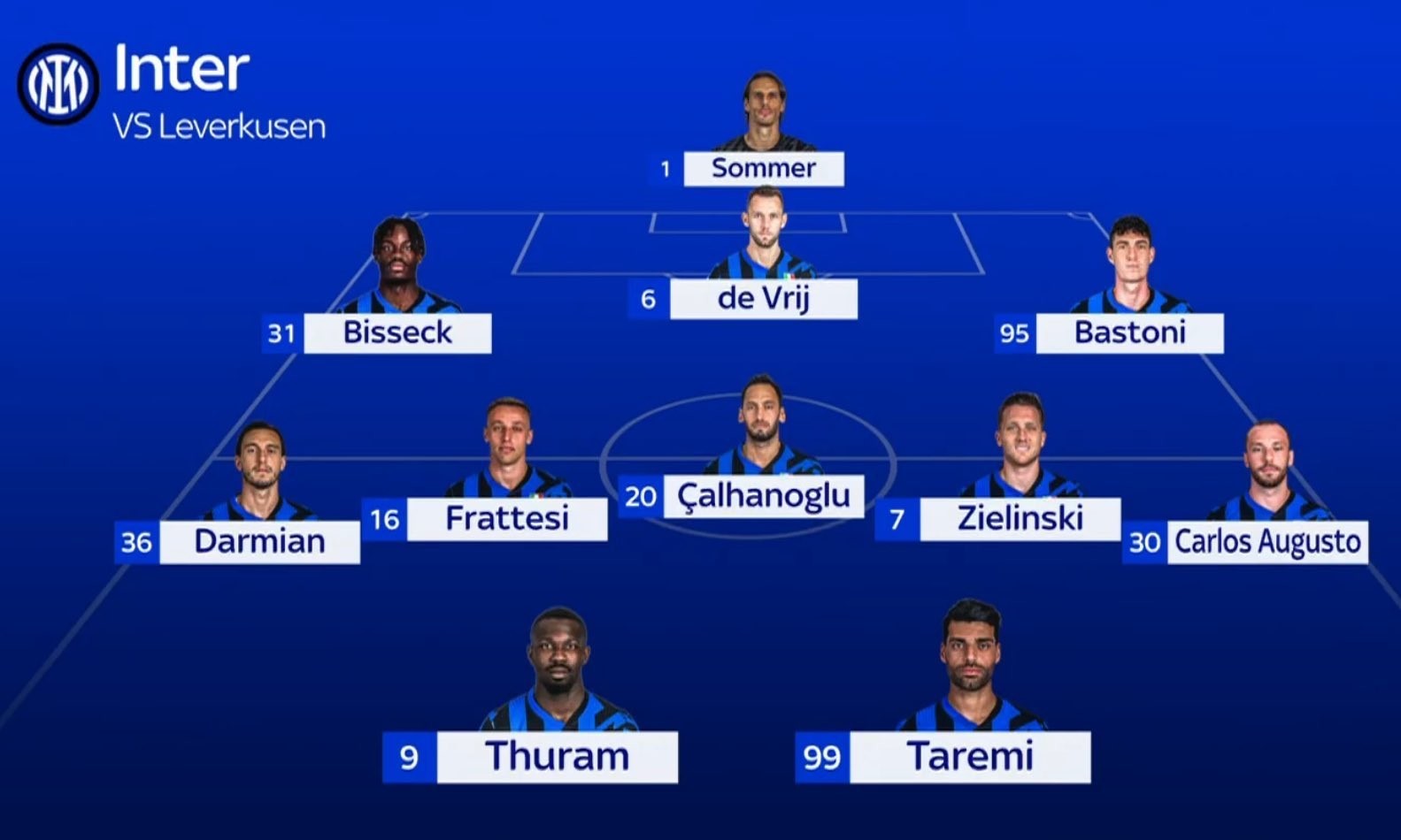 索默;比塞克、德弗赖、巴斯托尼;达米安、弗拉泰西、恰尔汗奥卢、泽林斯基、卡洛斯-奥古斯托;马库斯-图拉姆、塔雷米