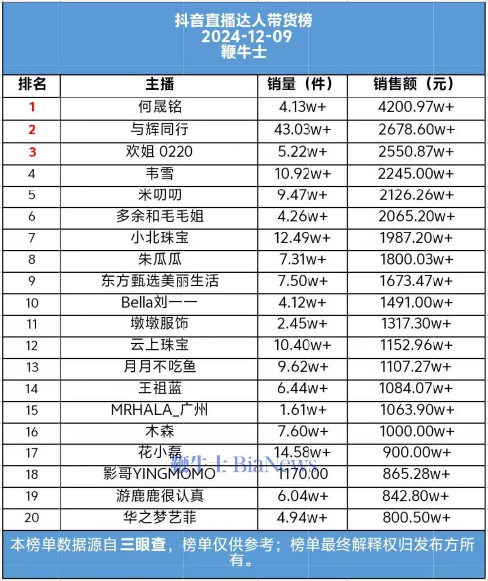 【直播带货日榜】是鞭牛士和三言科技推出的多个平台达人每日直播带货榜单。根据第三方数据平台“三眼查”提供的数据,鞭牛士将对抖音平台的达人带货交易量、GMV、播放量进行统计和分析,以供各位从业者参考。
