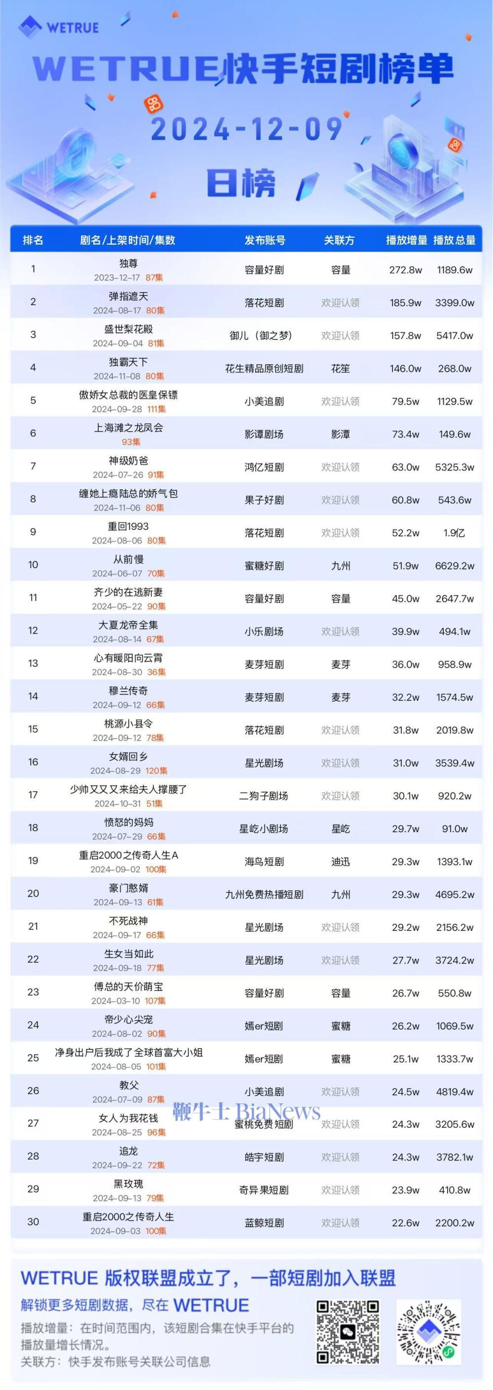 12月10日消息,为帮助短剧从业者提供更多信息,专注于短剧报道的新腕儿和科技媒体鞭牛士联合WETRUE短剧热度榜共同推出多种短剧热度榜。