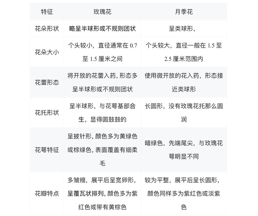 在古代文献中,玫瑰花被称为“徘徊花”,意指其花朵常在风中摇曳,令人流连忘返。月季隽秀,姿色多样,四时常开,深受人们的喜爱,是中国十大名花之一。玫瑰与月季,作为中药界的两颗璀璨明珠,自古以来便在中医药领域占据着举足轻重的地位。它们不仅以其独特的形态和芬芳的香气吸引着人们的眼球,更以其丰富的药用价值在中医临床治疗中发挥着不可替代的作用。然而,尽管两者同属蔷薇科植物,但玫瑰属于蔷薇属,而月季则属于月季属,玫瑰与月季在外观上虽有着诸多相似之处,但还是有些许的差异: