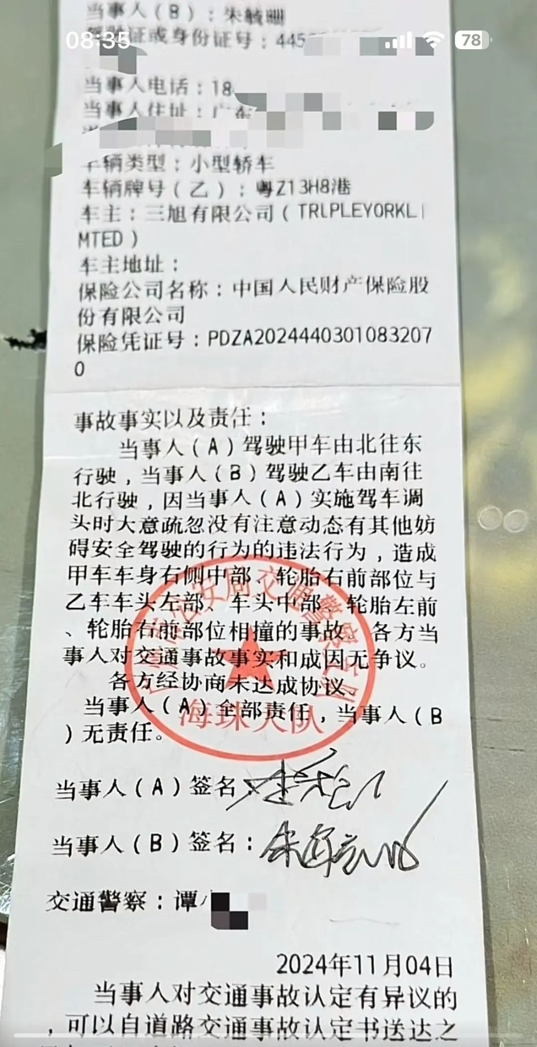 劳斯莱斯车主还在视频中晒出了交警给出的交通事故责任认定书,部分内容显示:当事人(A)实施驾车掉头时疏忽大意没有注意动态有其他妨碍安全驾驶的行为的违法行为,造成甲车和乙车受损。