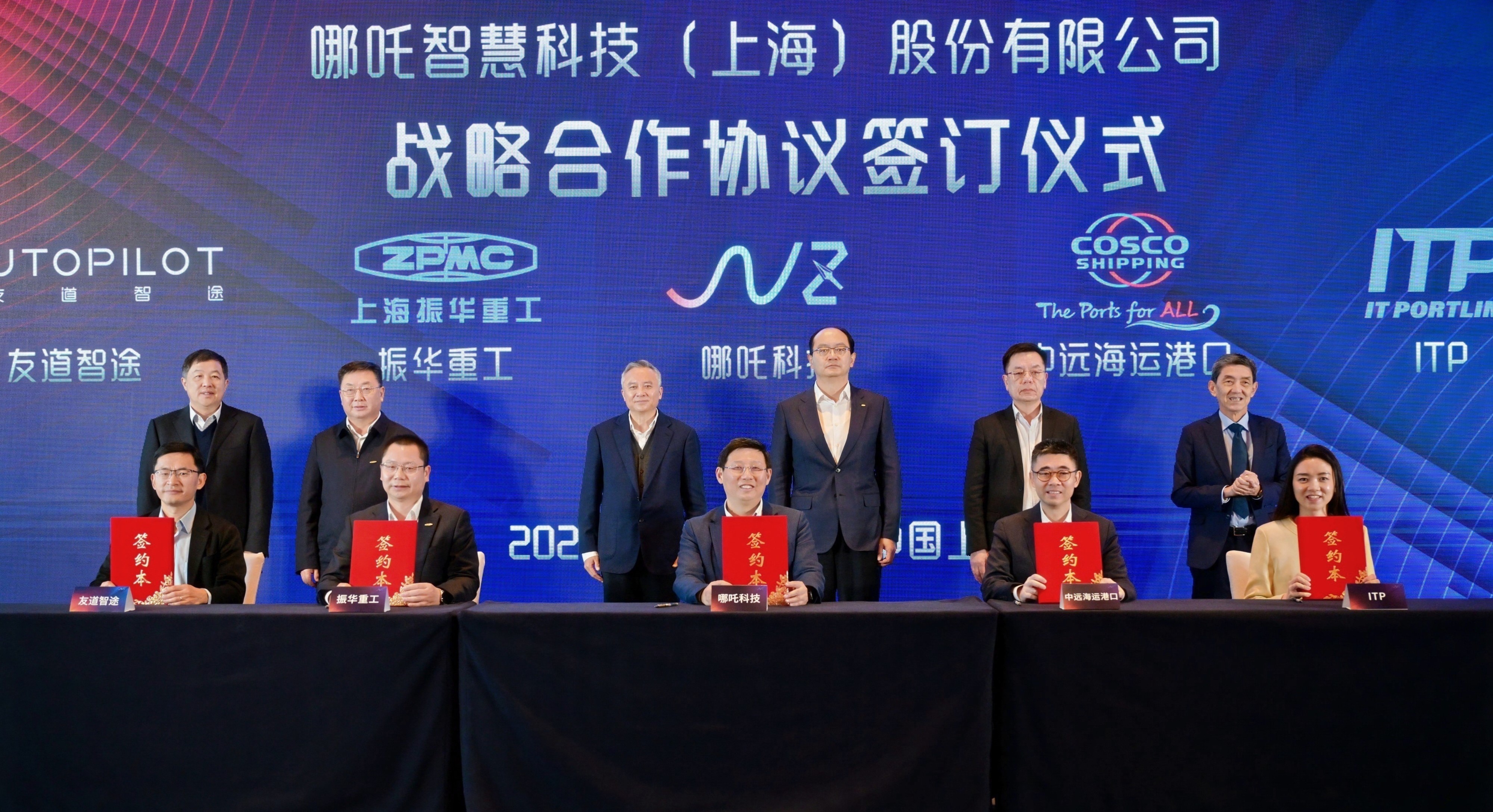 会上,哪吒科技与中远海运港口有限公司、上海振华重工(集团)股份有限公司、上海友道智途科技有限公司、IT PORTLINK等战略合作伙伴签订了合作协议。