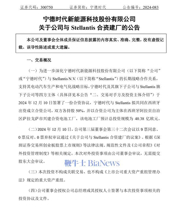 鞭牛士 12月10日消息,宁德时代今日宣布,与Stellantis拟共同在西班牙出资成立合资公司,双方各持股50%,并以合资公司为主体在西班牙阿拉贡自治区萨拉戈萨市兴建合资电池工厂。