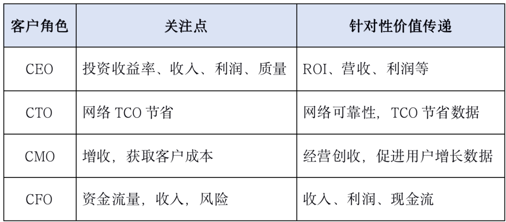 4. 价值营销。价值营销就是要传递好价值,促销价值销售,因此价值销售与价值传递在价值定价中起到关键的作用。所以价值定价还需要构建价值营销团队,通过团队中不同角色向客户定向传递产品或者解决方案的价值。华为一般根据客户不同层级和角色进行针对性的价值传递。