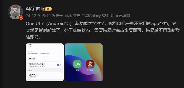 12 月 10 日消息,数码博主@i冰宇宙 近日爆料,One UI 7 新增应用存档功能,应用可暂时“卸载”。这项功能可以保留用户数据的同时,暂时“卸载”应用本体,点击后会重新恢复数据,包括登录状态。