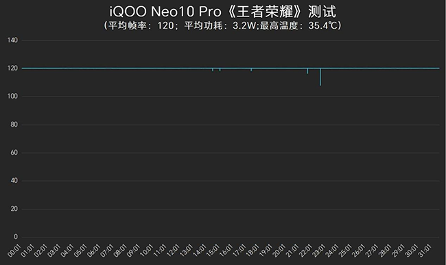 在《王者荣耀》中,iQOO Neo10 Pro提供了高画质超分和优化功耗插帧选项,在游戏特效拉满的情况下,半小时平均帧率为120帧,帧率曲线真的是稳如一条直线,平均功耗仅为3.2W,机身背面温度为35.4℃。