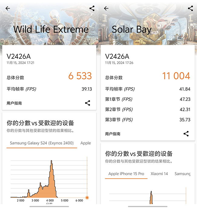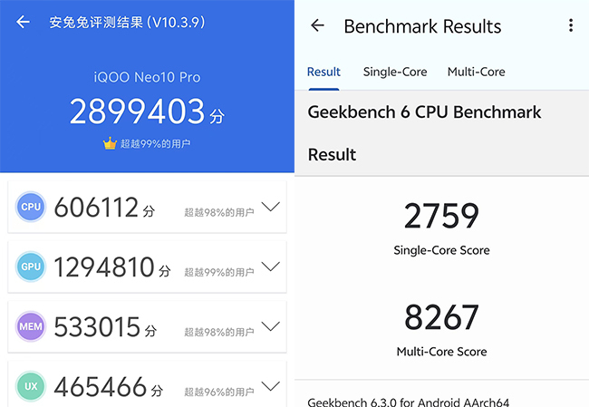 实际跑分层面,iQOO Neo10 Pro在安兔兔中的综合测试中跑分接近300万,Geekbench 6中的多核成绩为8267分,单核成绩为2759分,在3DMark Wlidlife模式下6533分,在专门测试的手机光追性能的Solar Bay模式它的成绩也达到了11004分。在当下的电竞手机中算是性能释放非常出色的了。