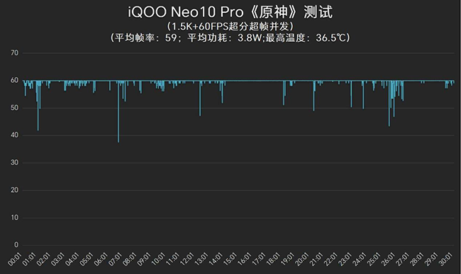 iQOO Neo10 Pro可以将《原神》画质超分至1.5K,和常规的810P画质相比,人物、房屋、树木的细节都得到了明显的提升,甚至可以和PC的显示效果媲美。并且在这个模式下也能超分至60帧,做到流畅度和画质兼得,半小时平均帧率59帧,平均功耗为3.8W,机身最高温度为36.5℃,功耗和帧率控制在和原始画质同一水平。