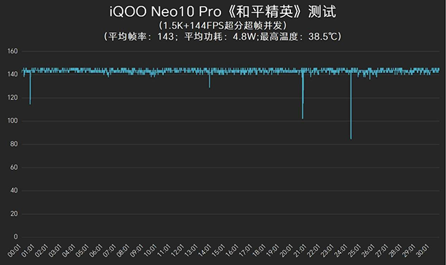 iQOO Neo10 Pro是目前少数支持《和平精英》1.5K+144FPS超分超帧并发的机型,所以常规模式就不测了,直接将游戏特效和超分超帧拉满,半个小时平均帧率为143帧,帧率曲线基本没有明显的抖动,平均功耗为4.8W,机身背面最高温度为38.5℃。