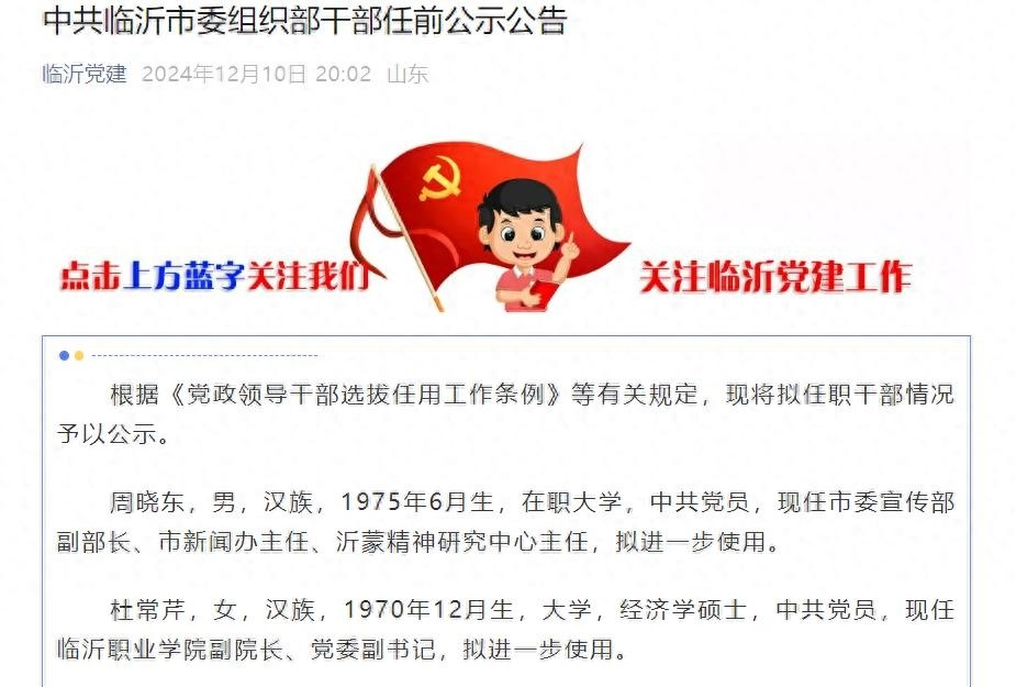 周晓东,男,汉族,1975年6月生,在职大学,中共党员,现任市委宣传部副部长、市新闻办主任、沂蒙精神研究中心主任,拟进一步使用。