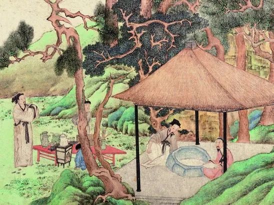 和陈继儒并列「吴门四大家」的文徵明在1518年去无锡惠山游玩时,画下了他户外「茶会」的社交场景:《惠山茶会图》。图为局部