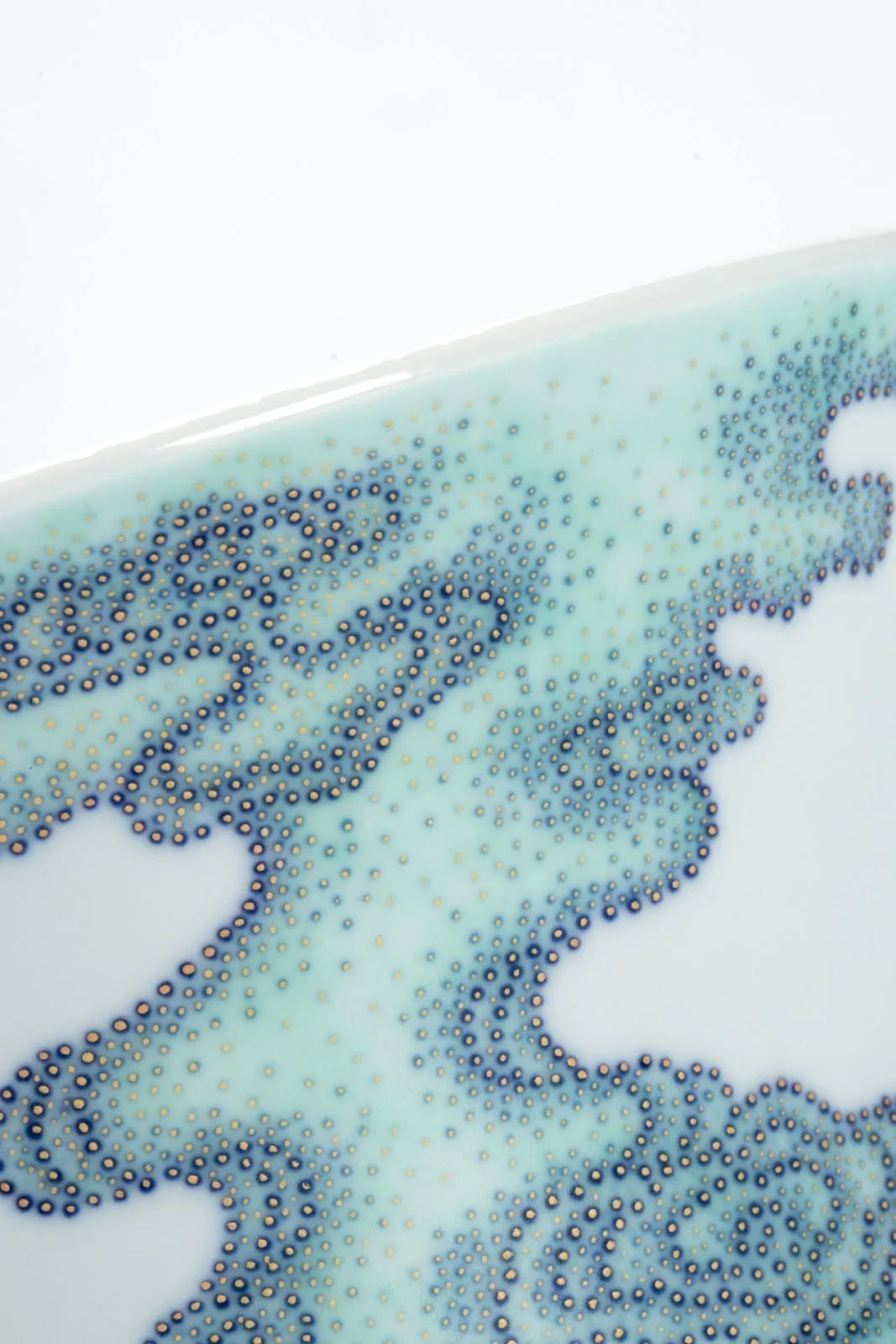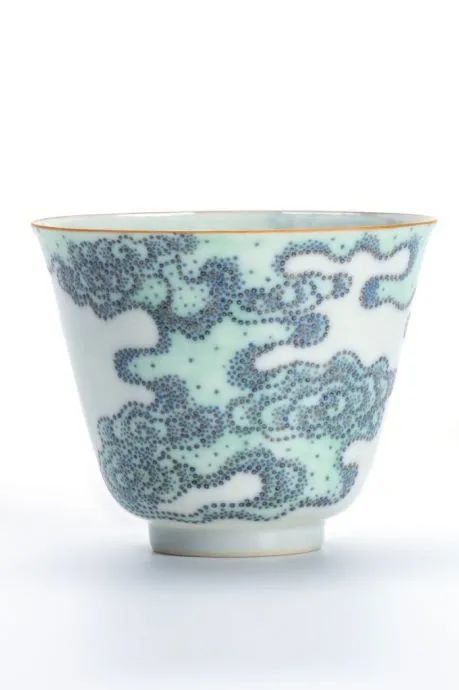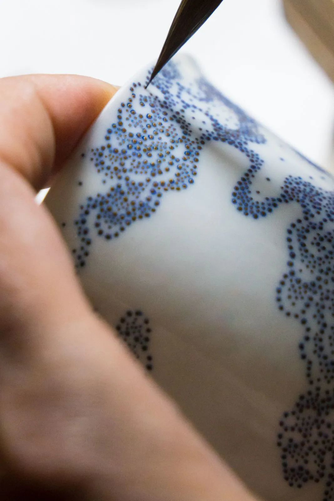 此次何鑫设计的瓜棱斗彩祥云系列,茶壶以宋代常见的瓜棱壶为蓝本,不仅有古意,也能够适应西式的喝茶习惯。整套器具以白瓷为主,传统云纹以玲珑瓷半透雕刻手法呈现,青花点作底色,覆盖金点。