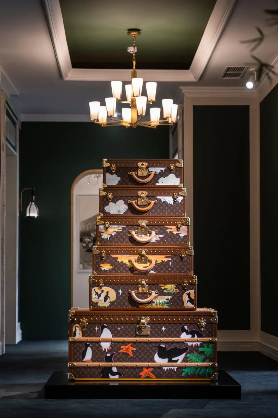 周轶伦以经典Monogram帆布为载体,将其画作中的企鹅与海边落日余晖等拆解后,加入了珊瑚、热带植物、海星及云朵等,逐一描绘于Louis Vuitton硬箱塔上,构建了一幅极地与赤道和谐共处的荒诞场景。