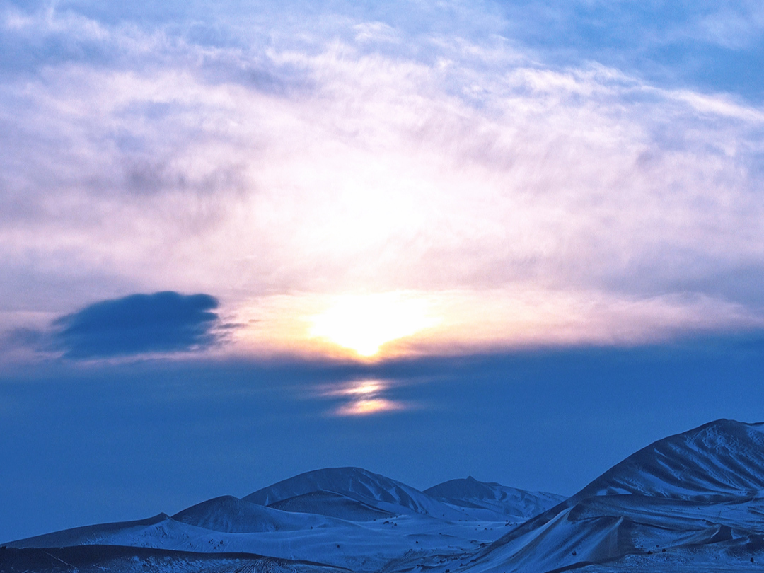 清晨晨曦划破天际,连绵起伏的鸣沙山在白雪的覆盖下,犹如一条条银龙在沙漠中蜿蜒盘踞,雪面泛起的银光与沙脊勾勒出的金色轮廓相互交织,在广袤的沙漠中绘就了一幅如梦如幻的画卷。游客们沿着登山梯攀登而上,抵达山顶后,银装素裹的月牙泉映入眼帘,宛如一颗美玉镶嵌在白雪皑皑的沙海之中。