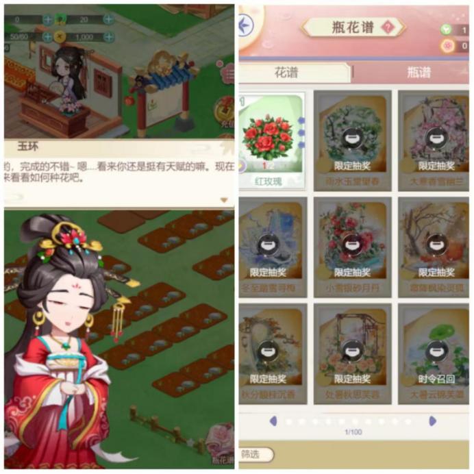 女性向国风模拟经营游戏,插花题材,这款游戏上线也两年了。以花卉培育、种植为核心玩法,玩家通过种植种子来收获鲜花,鲜花可以用来插花和售卖。一些稀有种子只能通过抽奖获取。小游戏女性向赛道确实还有待发掘,目前数量不多,而且还未出现头部产品。