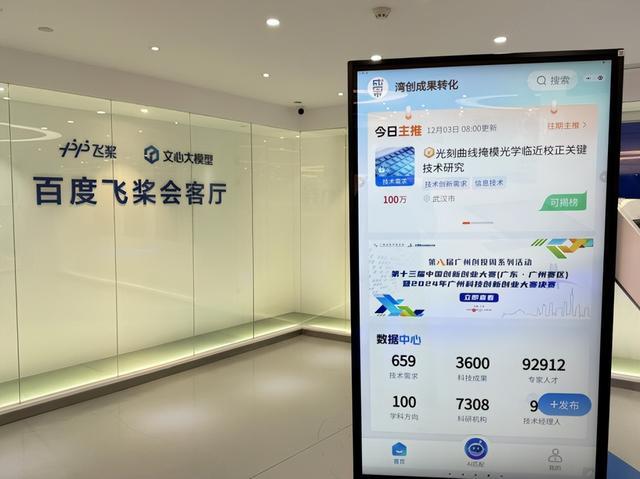 当然,展厅还有大湾区中心首创“人工智能+技术情报+全国协作网络”的科技创新体系,自主研发的湾创成果转化小程序,是基于百度AI的成果转化派单撮合平台,以线上工具+线下运营的方式,通过大数据实现创新要素的供需精准匹配,实现从创新测评—解决方案—匹配派单—跟踪评价的全流程闭环赋能服务,综合解决企业的场景、技术、人才、政策、资金等需求,服务产业需求端、技术供给端和技术经理人。在微观上通过测评提升企业的创新能力,在中观上基于技术情报为产业链强链补链,在宏观上成体系地提升区域整体创新能力,推动产业与科技互促双强。