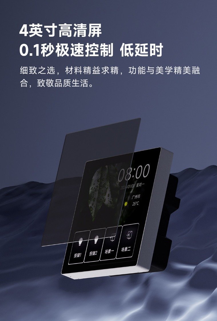 这款屏幕开关搭载了 4 英寸的屏幕,虽然自称高清屏,但实际分辨率为 480×480,按照分类应该算是“标清”。它采用标准的 86 底盒,可以方便地接入到家居当中,并且支持 485 通讯协议,可与空调连接,不过它的灯控线只有 L1 和 L2。