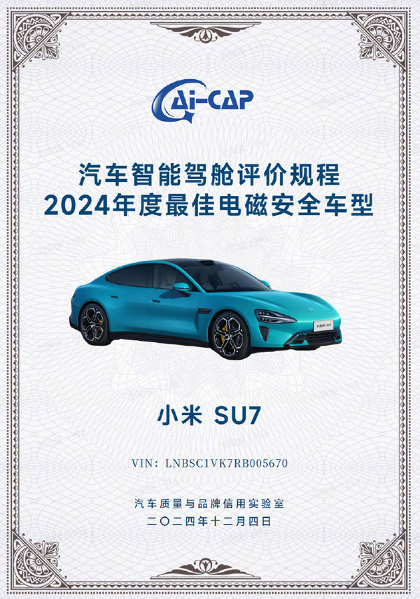【CNMO科技消息】12月11日,小米汽车官方宣布,在近日举办的「博鳌汽车论坛」上,小米旗下首款车型小米SU7凭借其出色的电磁安全性能,荣获了“2024年度最佳电磁安全车型”奖项,这一荣誉无疑是对小米汽车在电磁安全领域不懈努力的肯定。
