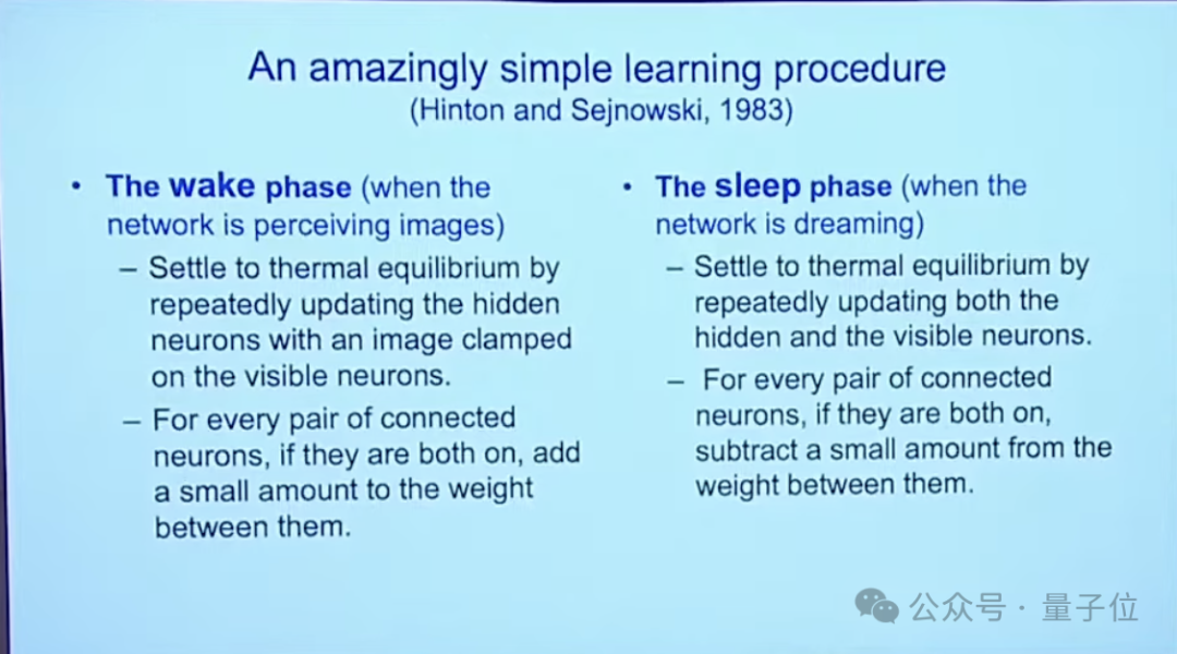 唤醒阶段固定图像于可见单元,让隐藏单元达热平衡后调整连接权重,睡眠阶段类似做梦更新神经元达热平衡后反向调整权重,该算法平均上能让网络生成图像过程类似感知图像,涉及对数似然梯度概念,通过改变权重使网络关注wake阶段看到的数据。