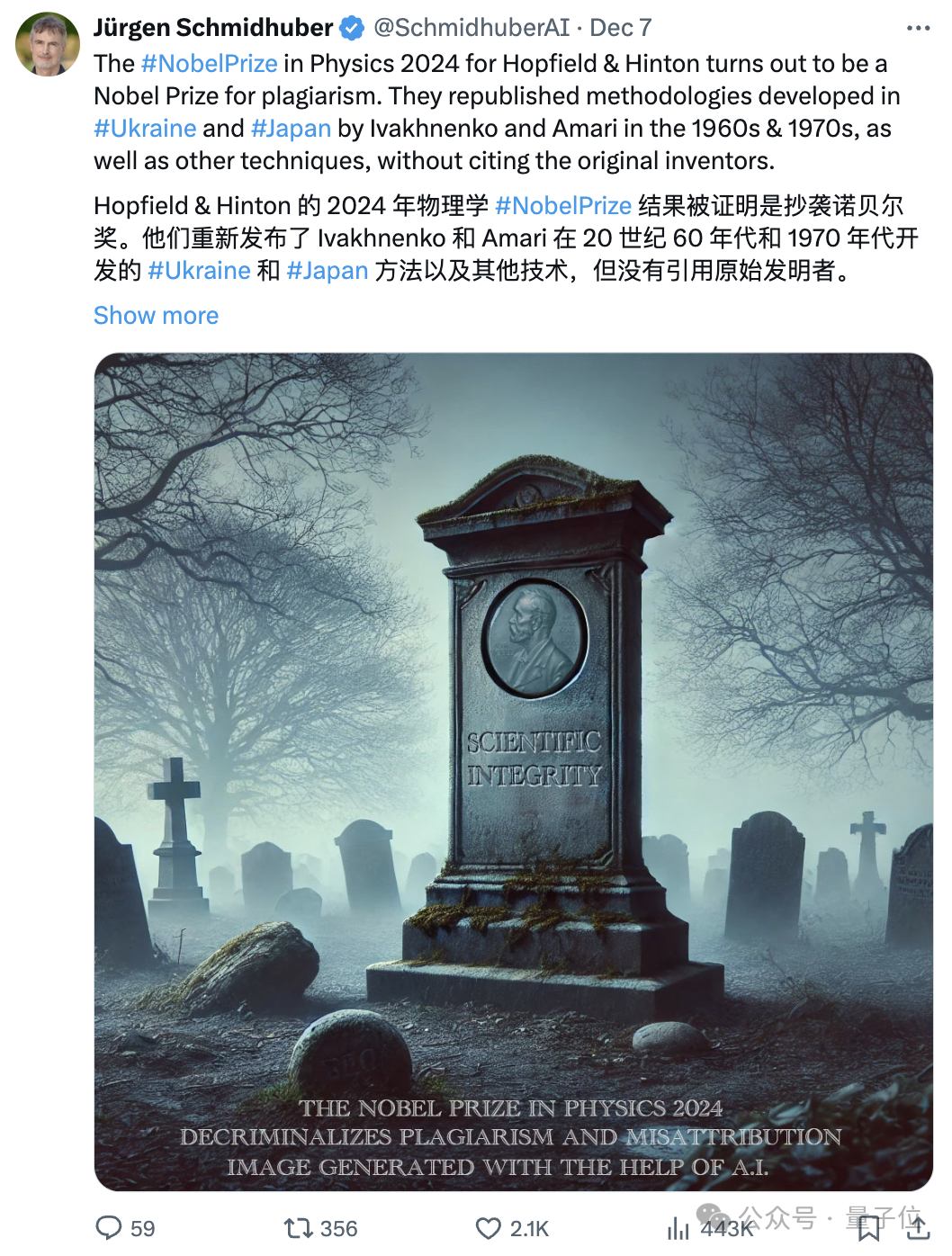 知名计算机科学家Jürgen Schmidhuber发表推文称,Hopfield & Hinton的2024年诺贝尔物理学奖是抄袭得来的。