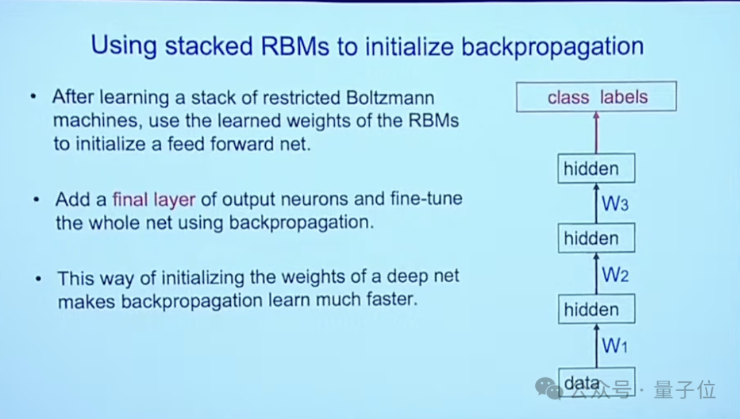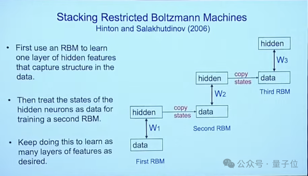 为构建特征检测器层可堆叠RBM,将前一个RBM隐藏单元活动模式当数据给下一个RBM,以此捕捉复杂相关性学习多组权重,堆叠后视为前馈网络可进行监督学习,这样初始化网络学习更快。因为网络已学习了数据结构,后面用于学事物名称相对容易,如识别物体方面。