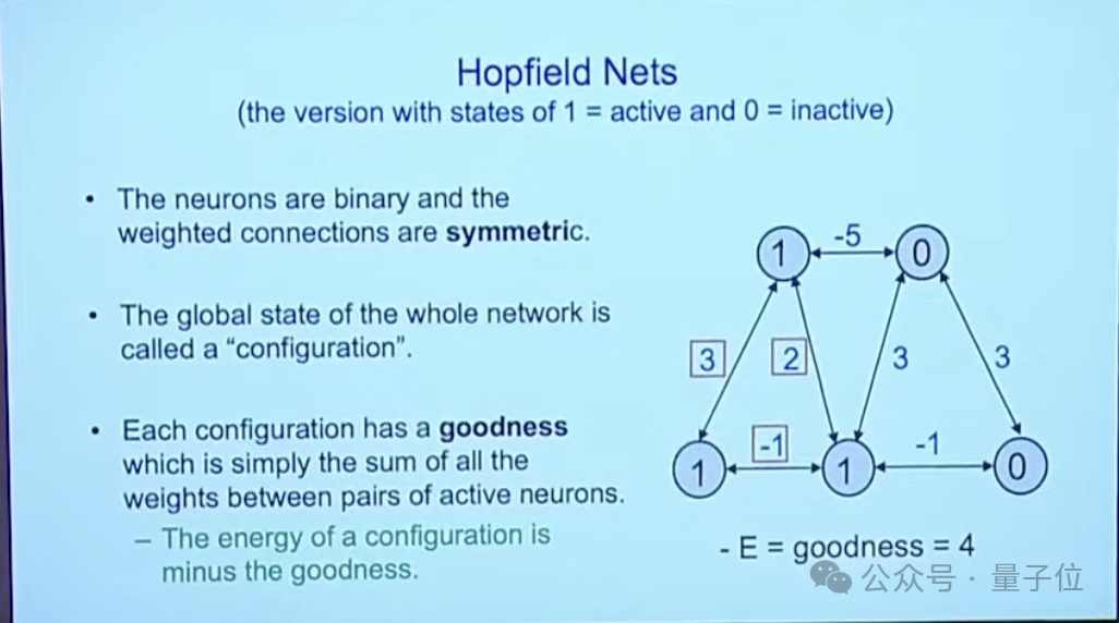 Geoffrey Hinton教授则用通俗易懂的方式讲述了Hopfield网络和玻尔兹曼机器的原理与发展,全程没有用一个方程式。