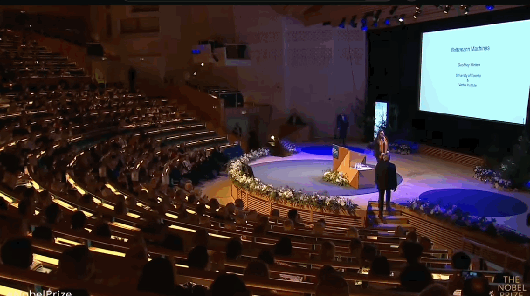 看到Hopfield教授即使借助拐杖也亲自到达现场发表了演讲,Hinton教授也忍着腰痛专程飞到瑞典,让观众们非常敬佩。