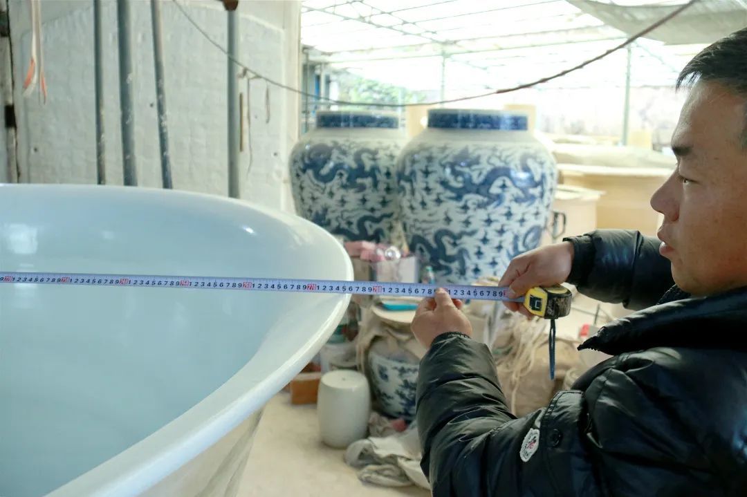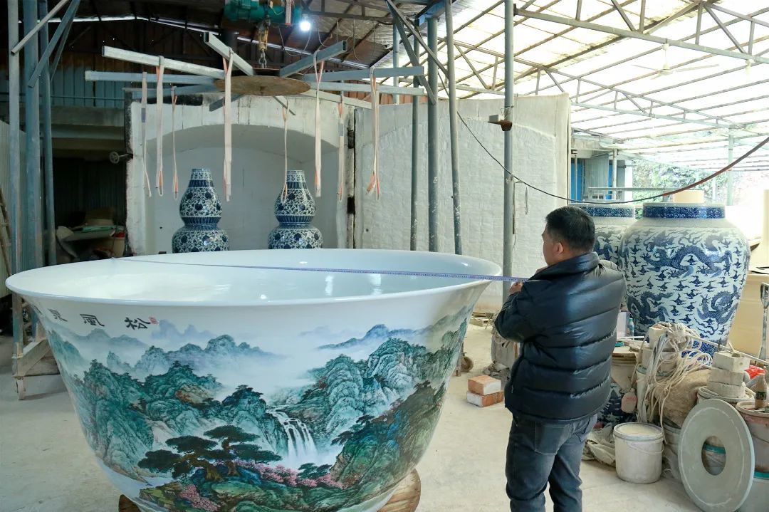 “第一次挑战这么大的器型,说不紧张肯定是假的。”荣勤陶瓷创始人黄宇平表示,虽然这些年一直是做大件陶瓷,但尺寸(最大直径)普遍在2米左右,这次尺寸跨度很大,制造难度也是前所未有的。特别是最后大碗入窑烧制的关键时刻,他的心一直都是悬着的,直到打开窑炉看到大碗器型完整未变形,釉面图案完好,才长舒了一口气。经过现场测量,碗口最大直径为2.76米,创下了手工陶瓷制作大碗的最大尺寸纪录。