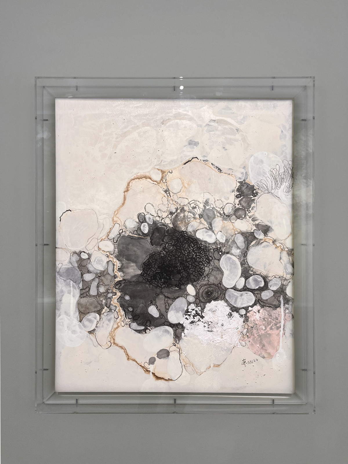 当观者看到展览中的系列作品《无题》时,无论从其对绘画的处理、形式的统一、构图的平衡还是主题本身等多个方面,都展示了艺术家的观念与技法。“偶然性”与“分层”是其显著的特征,即一种委婉的对水墨画的折叠保存,将地域与在地之物全部置于时间的流逝与变迁之中。展览中五幅风格各异的绘画作为不同系列的代表,展现廖渊在创作过程的思索与转变,并让人们看到这一路径尚未发生的延续。