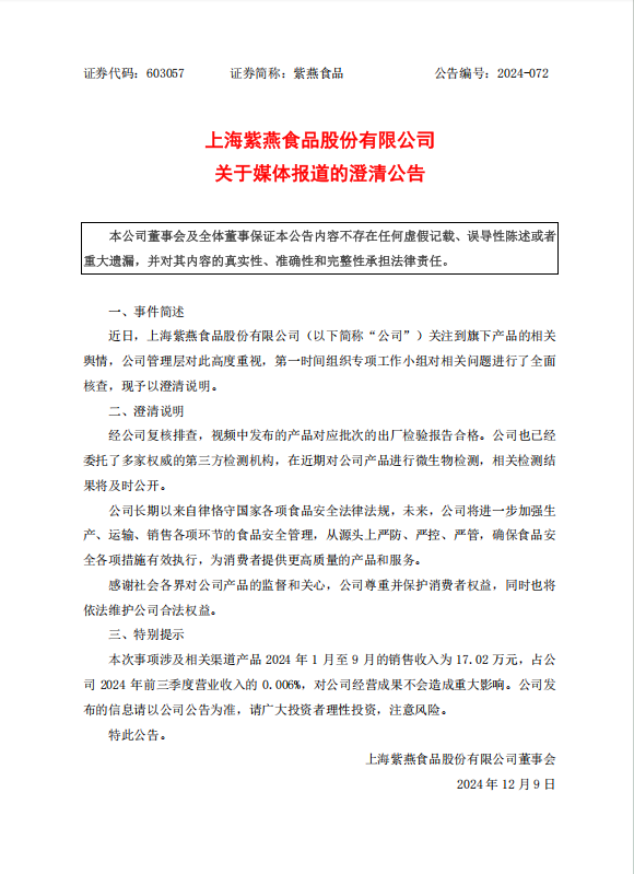 12月9日,紫燕食品(603057.SH)发布《关于媒体报道的澄清公告》称,“经公司复核排查,视频中发布的产品对应批次的出厂检验报告合格。公司也已经委托了多家权威的第三方检测机构,在近期对公司产品进行微生物检测,相关检测结果将及时公开。”