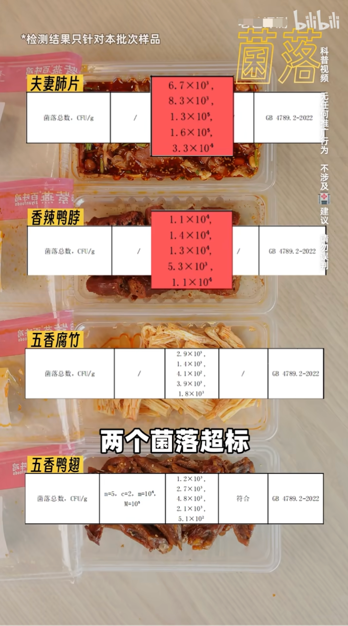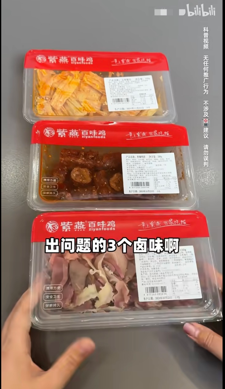 11月29日,某测评博主发布视频称,收到大量网友反映食用卤味后出现拉肚子的情况,因此其通过官方旗舰店渠道购买了绝味鸭脖、周黑鸭、煌上煌、紫燕百味鸡四家卤味品牌的产品。结果显示,绝味鸭脖、周黑鸭、煌上煌的全部产品均“过关”,仅紫燕百味鸡严重“翻车”,其受检测的四款产品(夫妻肺片、香辣鸭脖、五香腐竹、五香鸭翅)微生物检测结果不符合标准。其中夫妻肺片、香辣鸭脖两款产品菌落总数超标;夫妻肺片、香辣鸭脖、五香腐竹3款产品大肠菌群超过最高安全限量。