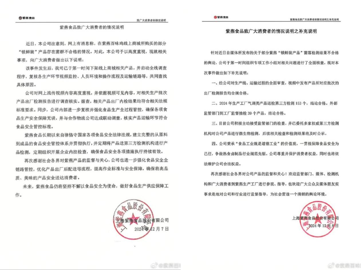 12月8日,紫燕百味鸡通过官方微博再发《补充说明》称,经公司对生产线、运输过程的全面审查,视频中发布的产品所应对批次的出厂检测报告均合规合格。《补充说明》还称,“目前公司积极主动接受监管部门的检查,并已委托多家权威第三方检测机构对公司产品进行微生物检测,后续相关检查和检测结果将及时公示。”