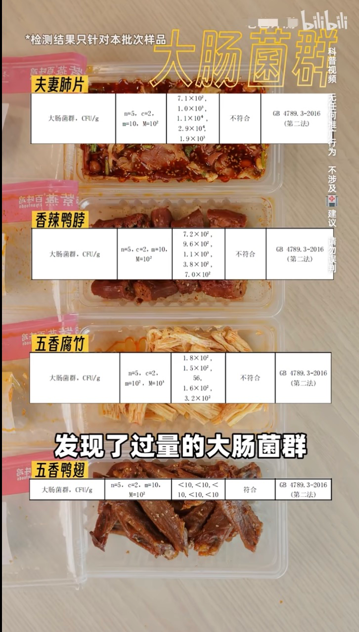 值得一提的是,在大肠菌群这一指标中,夫妻肺片与香辣鸭脖的5个样品检测结果全超出了最高安全限量,最高的一个超标290倍。