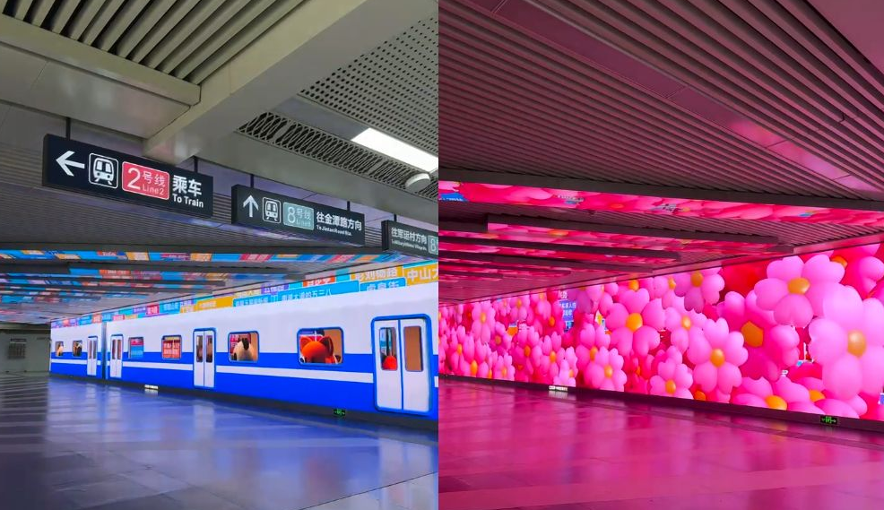 通道的显示屏上一会是疾驰而过的地铁动画,一会是满屏的粉红鲜花,配合调暗的灯光,沉浸感十足。