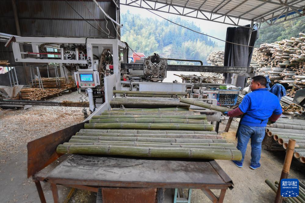 12月10日,村民在湖南省郴州市桂东县清泉镇桥头乡侠头村一家楠竹初加工企业进行楠竹开片。新华社记者 陈泽国 摄