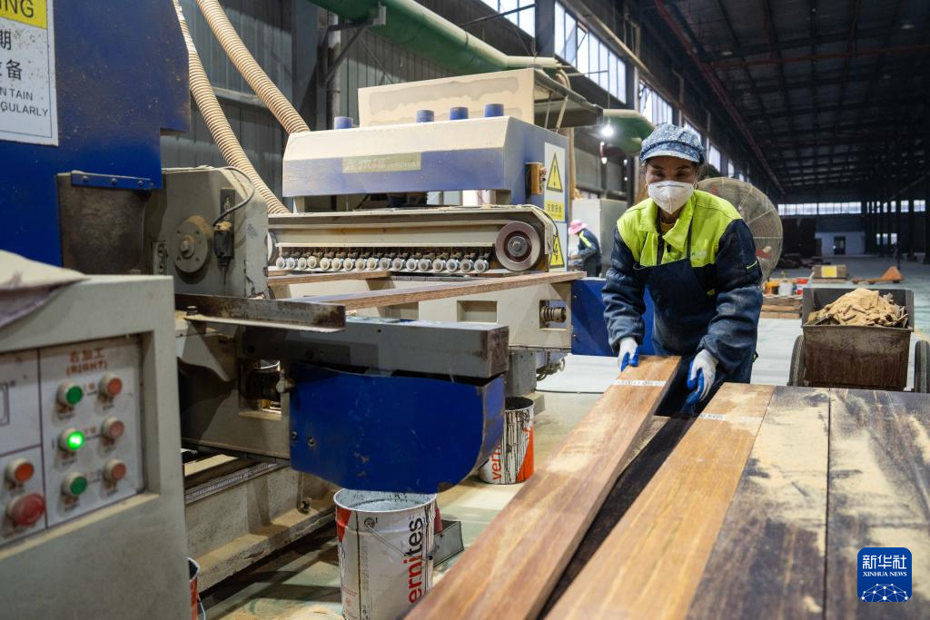 12月9日,在永州市双牌竹木产业科技园,湖南叁一科技有限公司的工人在竹木制品生产车间加工板材。新华社记者 陈思汗 摄