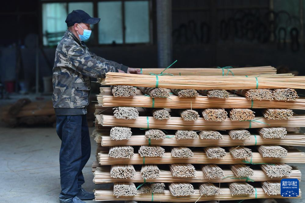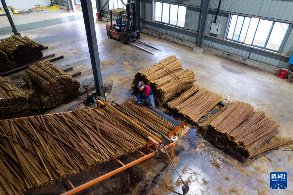 12月10日,村民在湖南省郴州市桂东县清泉镇桥头乡侠头村一家楠竹初加工企业整理拉丝后的楠竹。新华社记者 陈泽国 摄