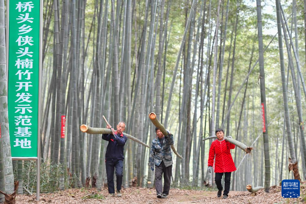 12月10日,在湖南省郴州市桂东县清泉镇桥头乡侠头村的楠竹开发示范基地,村民在搬运楠竹。