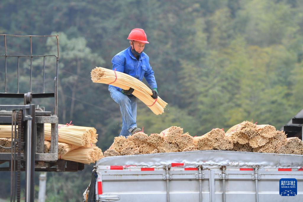 12月10日,村民在湖南省郴州市桂东县清泉镇桥头乡侠头村一家楠竹初加工企业将楠竹半成品装车。新华社记者 陈泽国 摄