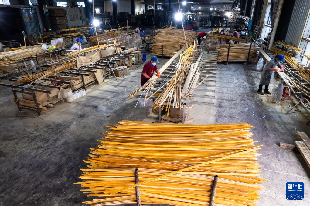 12月10日,在永州市双牌竹木产业科技园,湖南省有竹科技有限公司工人在加工竹条(无人机照片)。新华社记者 陈思汗 摄
