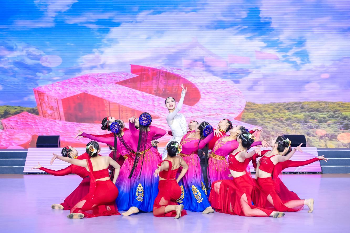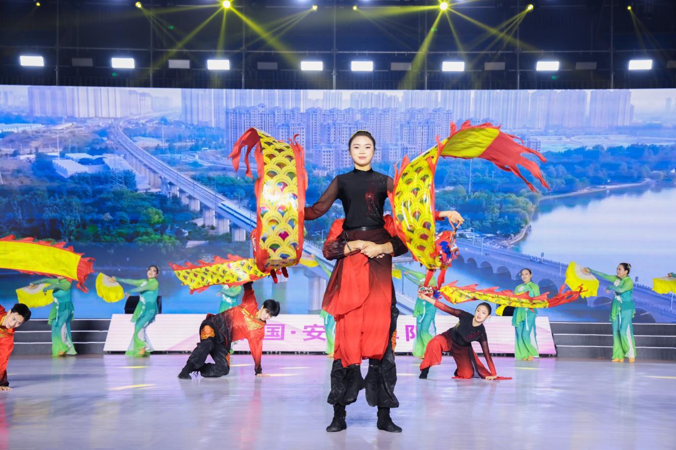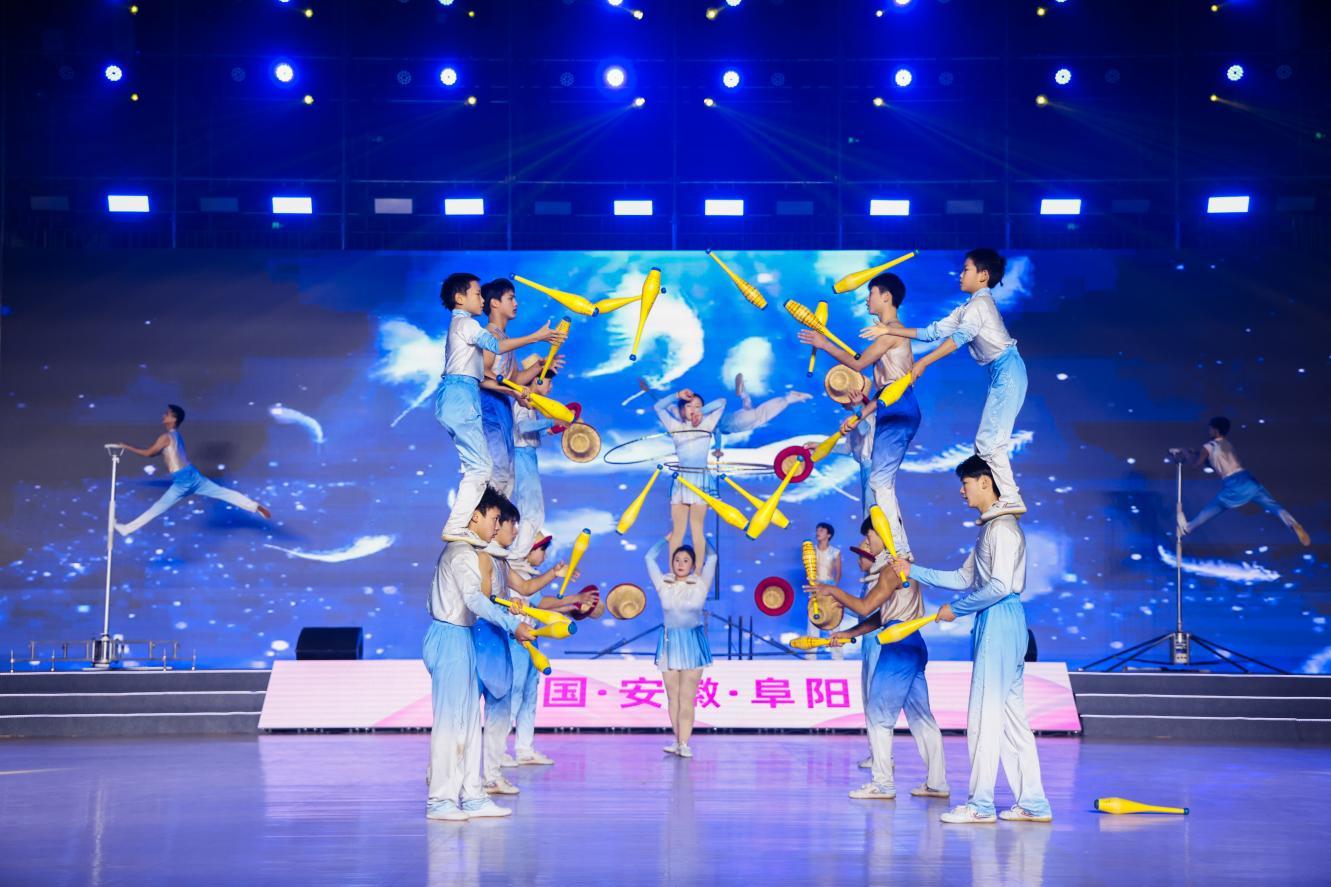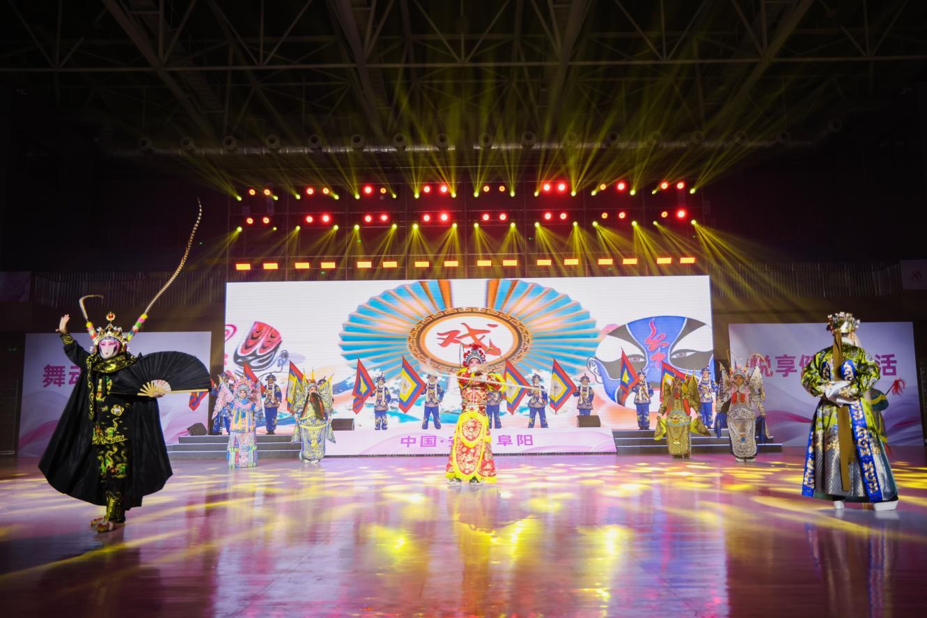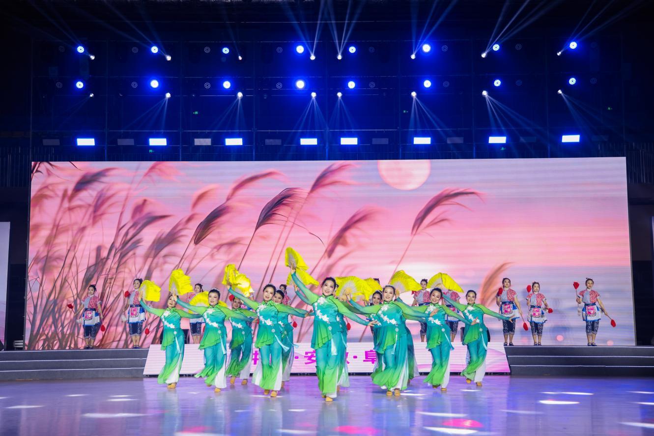 阜阳,这个坐落在颍淮之滨的皖北明珠,以其深厚的历史底蕴和独特的地域文化,为大赛增添了一抹迷人的色彩。开幕式上,“淮水流芳”的序篇如同一幅徐徐展开的历史画卷,将阜阳独特的民俗文化与现代审美完美结合,书画、剪纸、柳编等元素的融入,更是让观众仿佛置身于一幅幅生动的阜阳图景之中,感受这片烟火水乡的别样风情,也为后续精彩纷呈的表演奏响了序曲。第一篇章“向阳生长”中,杂技表演以颍淮儿女坚韧不拔、积极向上的精神为魂,将高难度的杂技动作与广场舞(健身操舞)的律动元素巧妙融合,让观众深刻感受到颍淮人民在这片土地上向阳而生、逐梦前行的奋斗力量;第二篇章“百花齐放”则是戏曲精粹《群英庆盛世》,国家级非物质文化遗产淮北梆子戏以其高亢激昂的唱腔唱响了盛世欢歌;第三篇章“向幸福飞”是各优秀参赛队伍带来的串烧表演,她们用热情洋溢的舞姿诠释着对幸福生活的向往与追求。